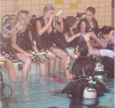 We moesten met zn alle op de rand van het zwembad gaan zitten en kregen een voor een al onze duik dingen om en aan.